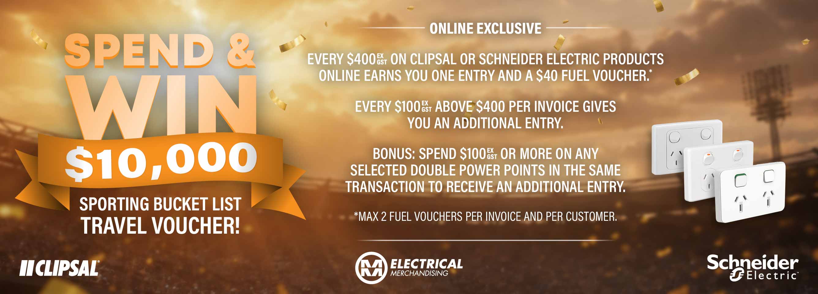 Shop online with MMEM throughout March 2026 for your chance to win a $10,000 Sporting Bucket List Travel Voucher as well as claim two $40 fuel vouchers simply by purchasing participating Clipsal and Schneider Electric products. Designed exclusively for MMEM account customers, this digital‑only promotion rewards your everyday online purchases with exciting prizes and bonus rewards. Participating MMEM Group brands include AWM, Brookvale Electrical Distributors, Cetnaj, D&W, EWM, Go Electrical, Haymans, MMEM, Power & Automation, Southern Electrical Wholesalers and TLE.